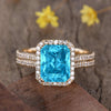 4 Carat Diamond Halo Swiss Blue Topaz Ring 8x10mm Emerald Cut 4mm Diamond Wedding Band Yellow Gold