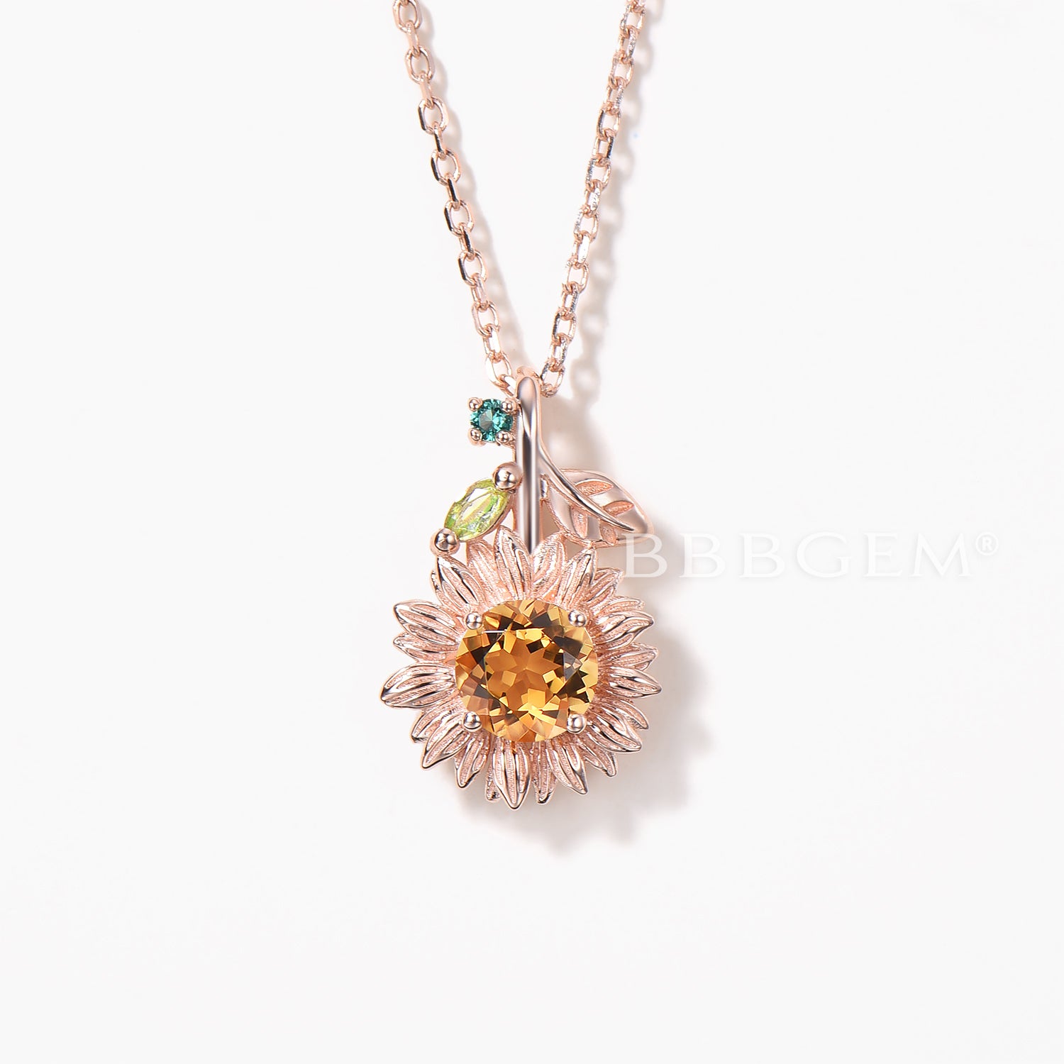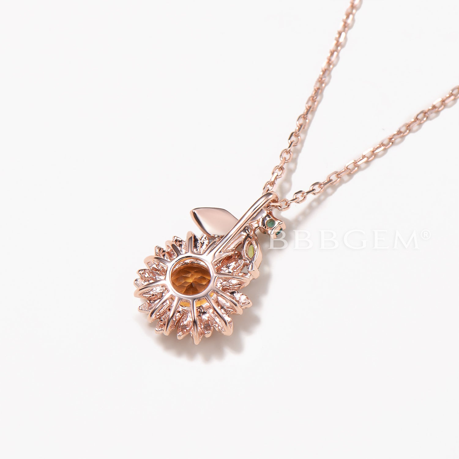 Round Cut Natural Citrine Sunflower Necklace Peridot Leaf Twig Inspired Pendant
