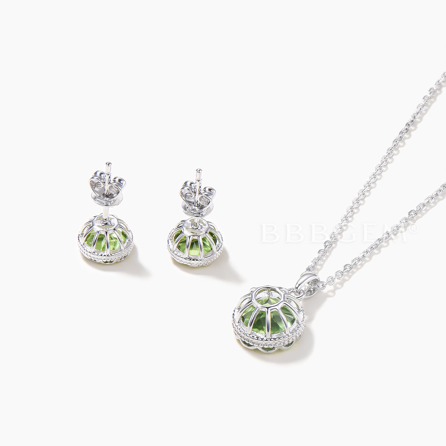 Solitaire Jewelry Set Round Natural Peridot Necklace White Gold Stud Earrings