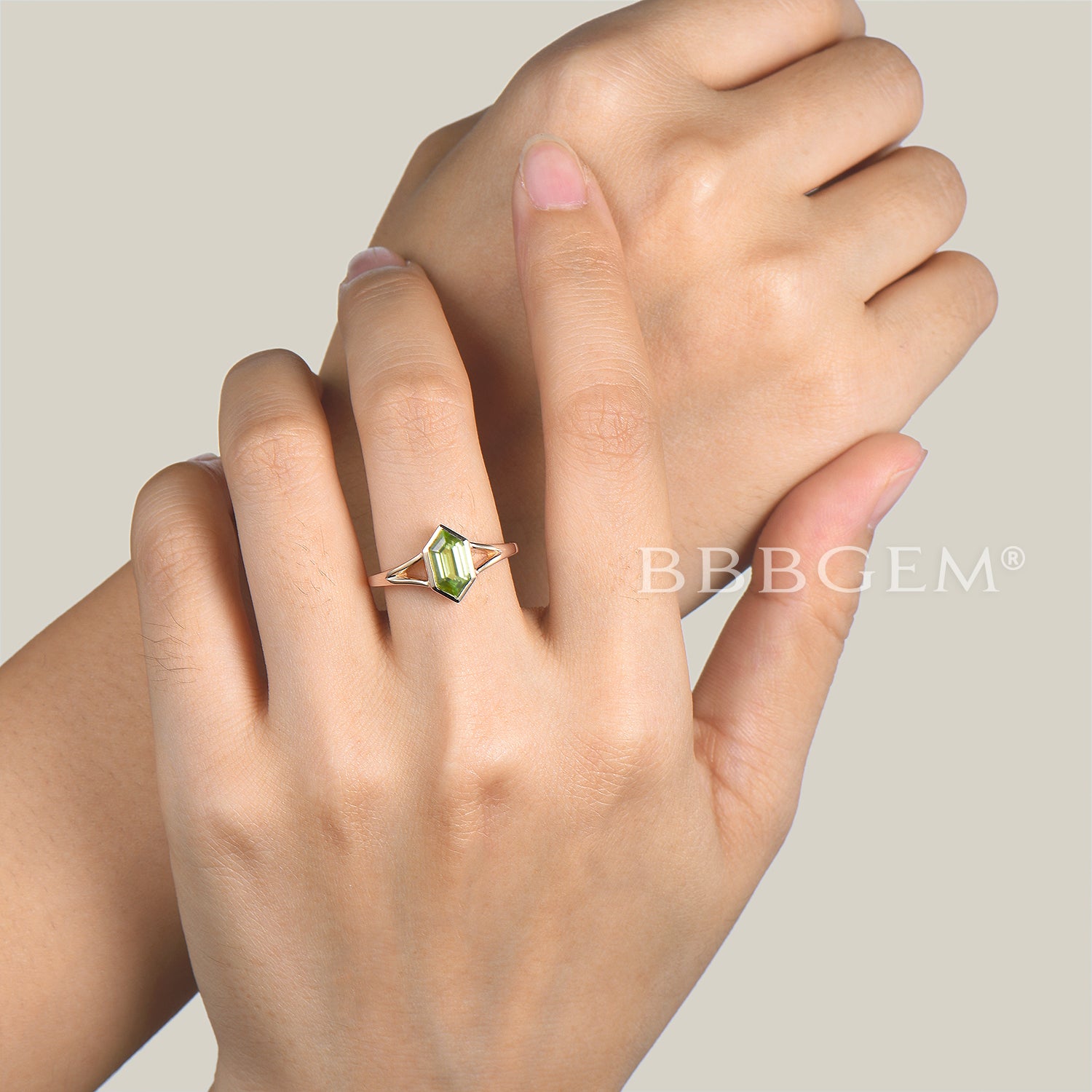 Hexagon Cut Natural Peridot Split Shank Engagement Ring Solitaire Ring