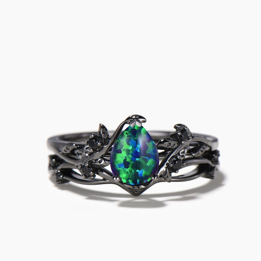 Pear Black Opal Nature Inspired Engagement Ring Emerald Black Gold Bridal Set