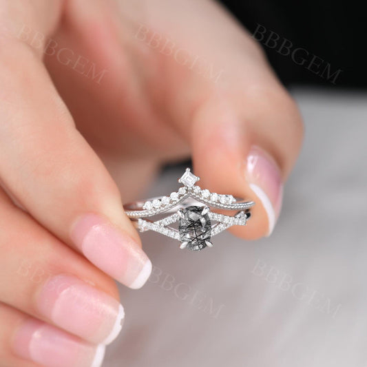 Black Quartz Rutilated Engagement Ring Unique Wedding Ring Set Antique Oval Shaped Ring Rose Gold Stacking Band