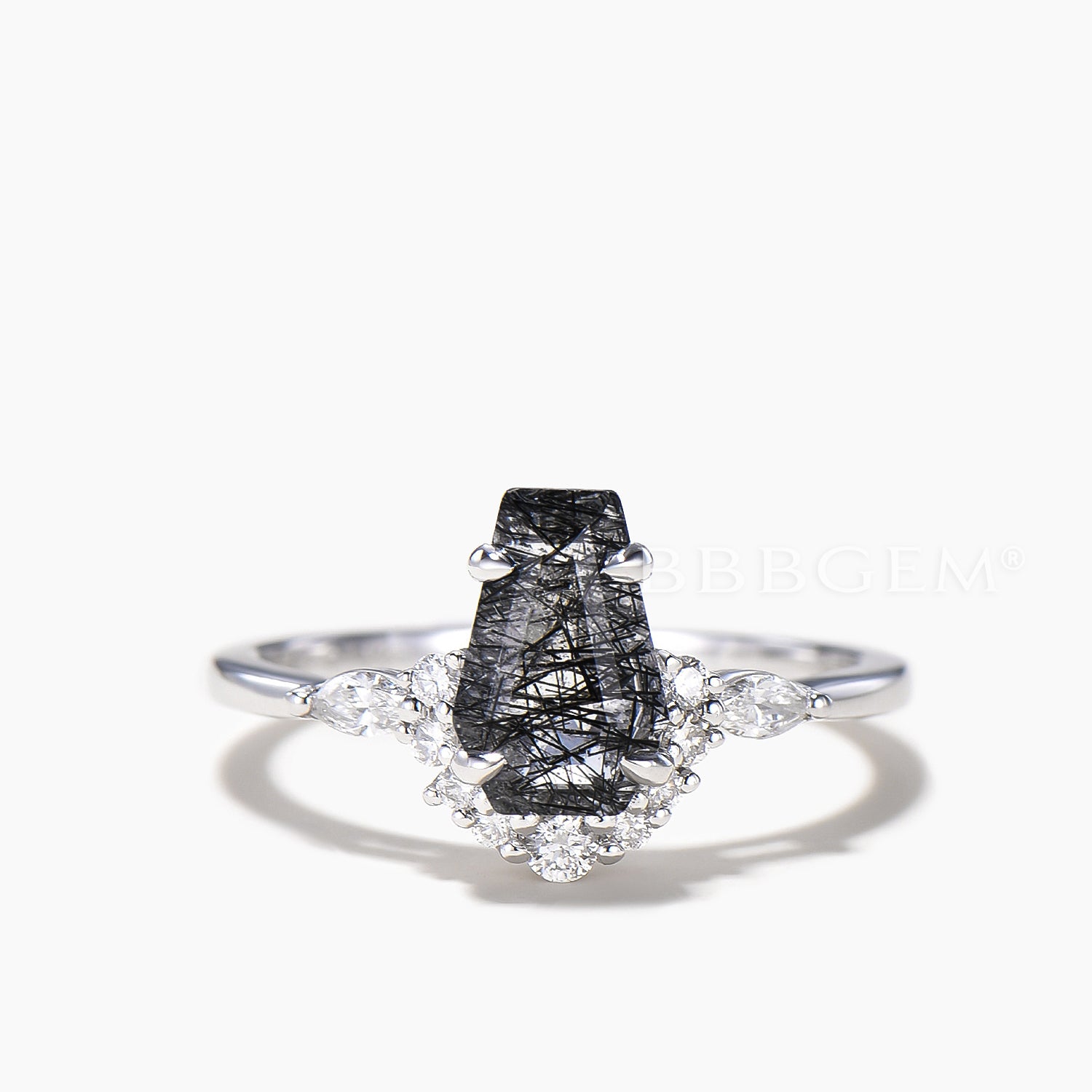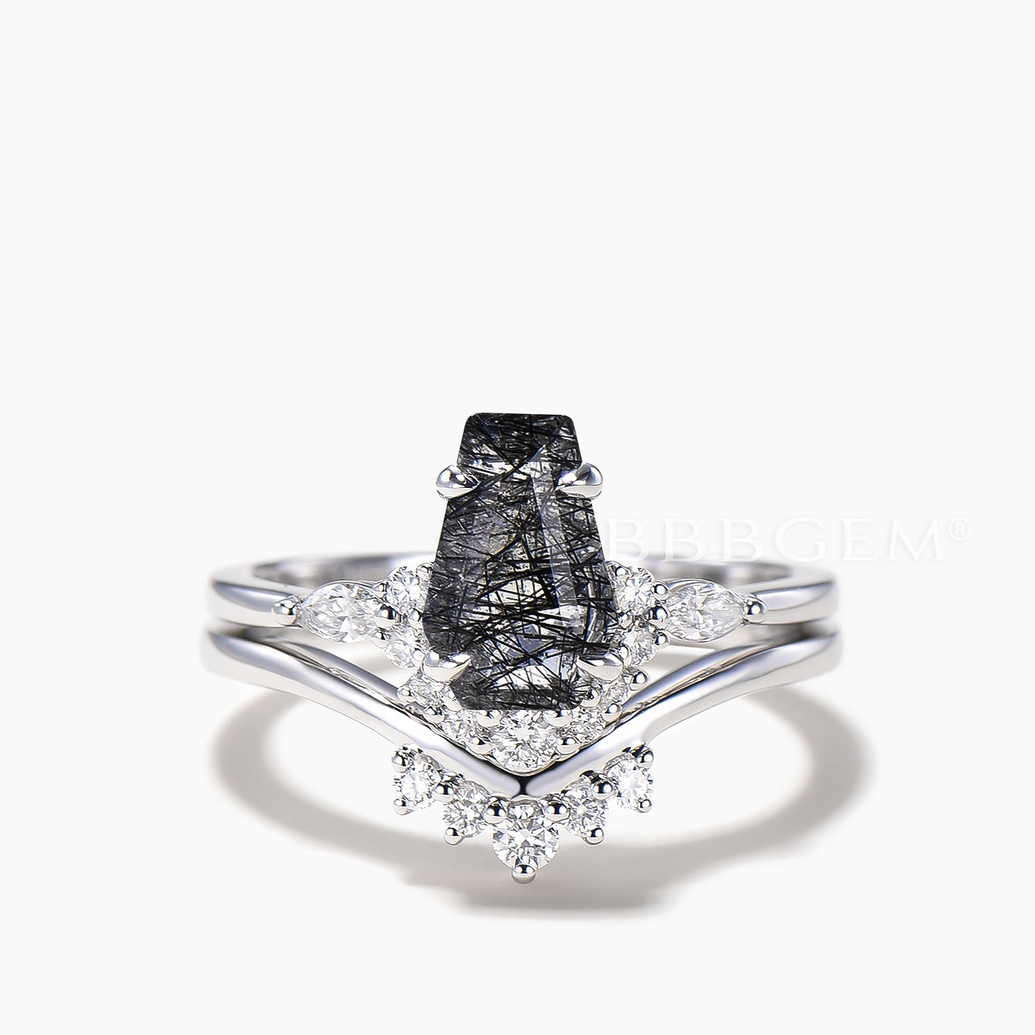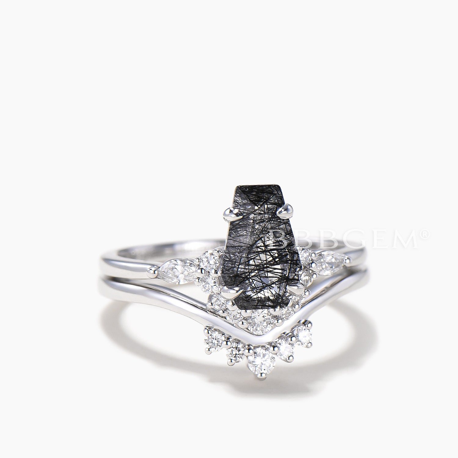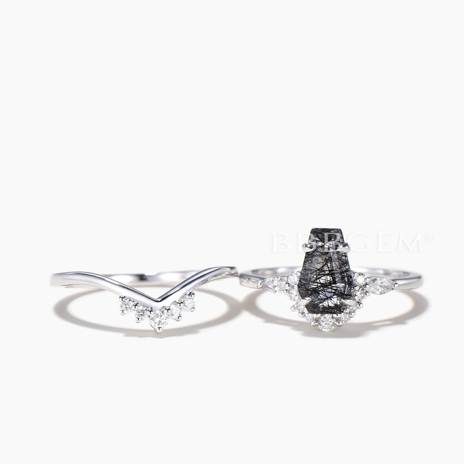Coffin Natural Black Rutilated Quartz Wedding Ring Diamond Curved Band Ring Set