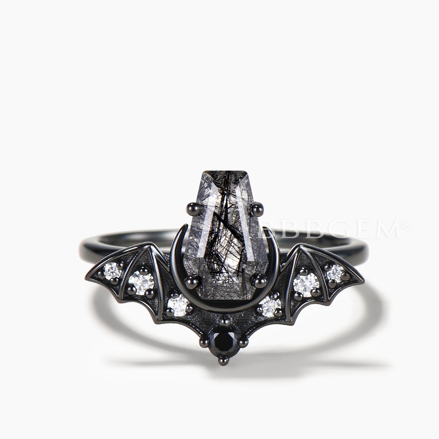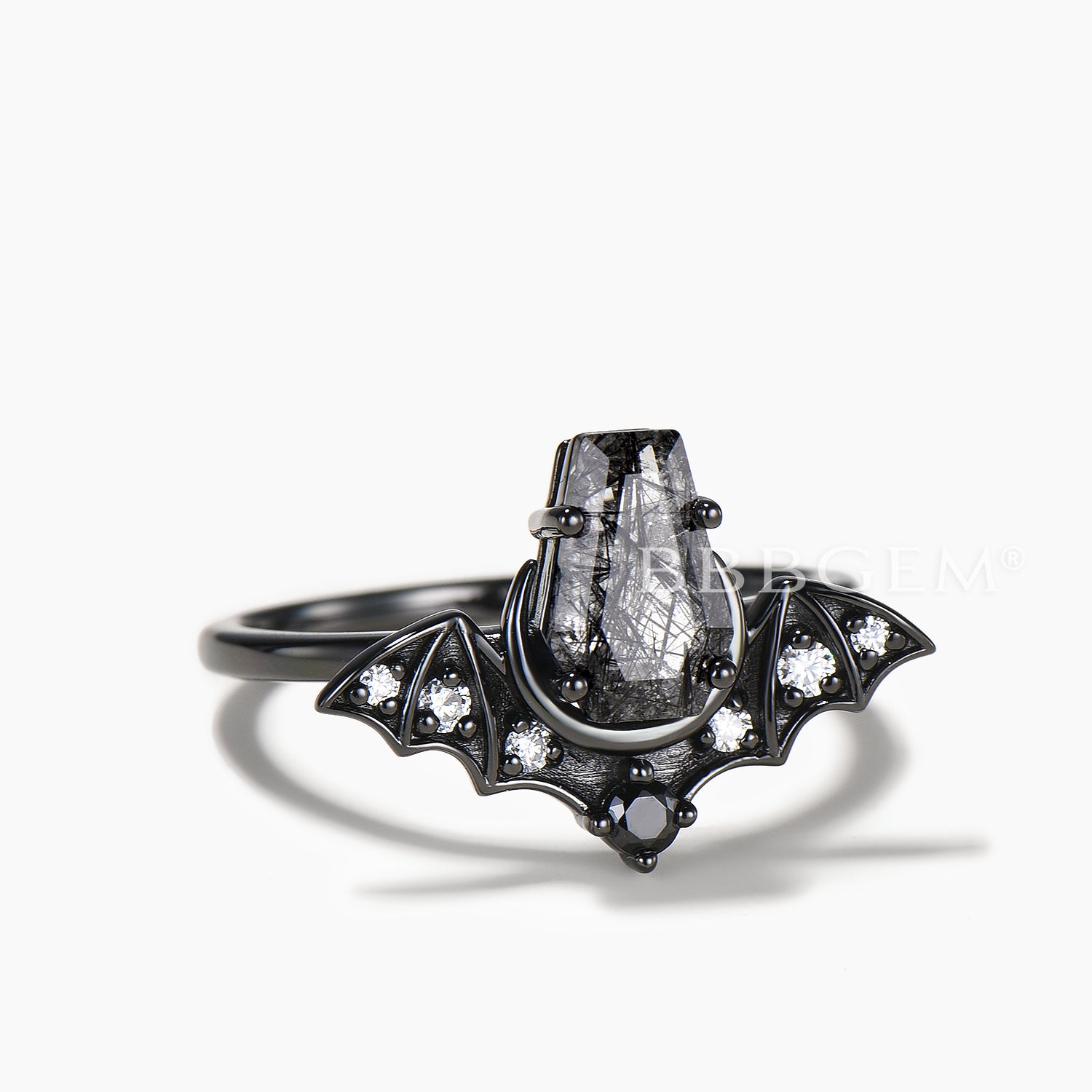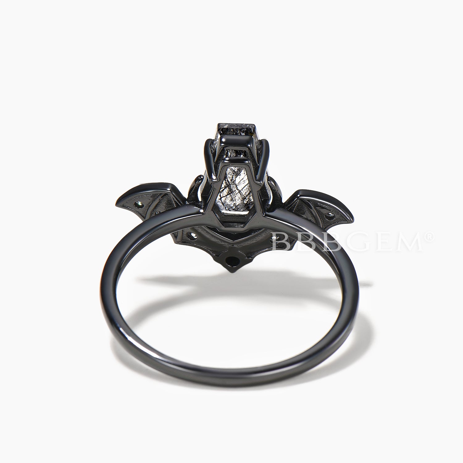Retro Coffin Cut Natural Black Rutilated Quartz Gothic Bat Wedding Ring