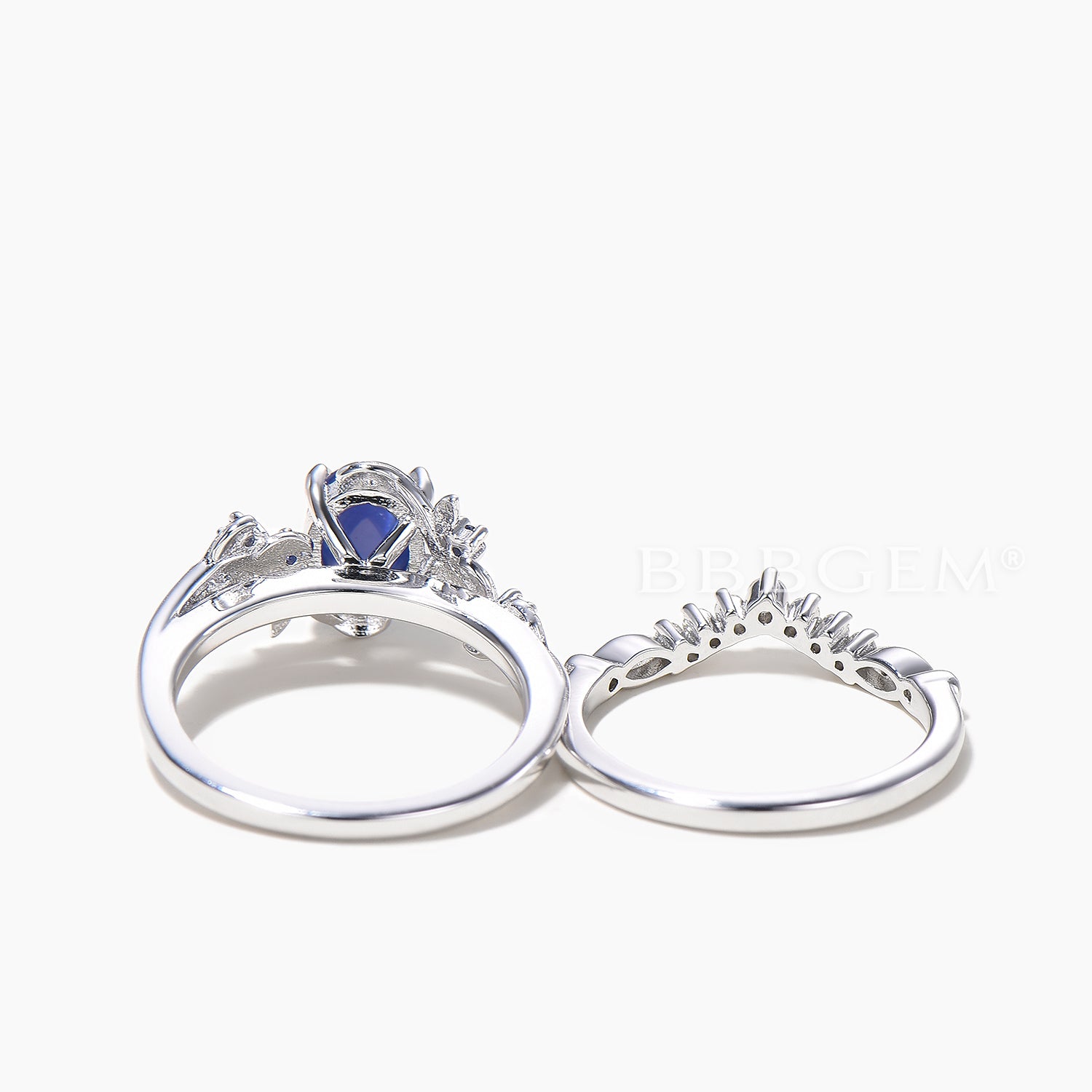 Oval Cut Star Blue Spphire Wedding Ring Diamond Curved Nature Inspired Ring Set