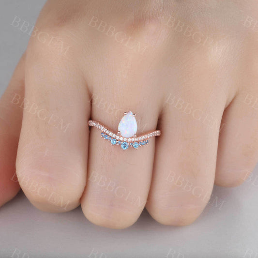 Vintage Opal Engagement Ring Set Rose Gold Wedding Set Unique Curved Blue Topaz Stacking Band Bridal Set
