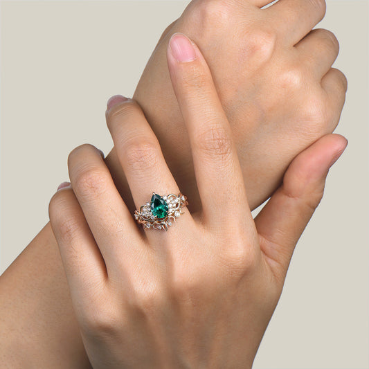 1.25ct Teardrop Cut Green Emerald Nature Inspired Bridal Set Emerald Leaf Black Gold Ring