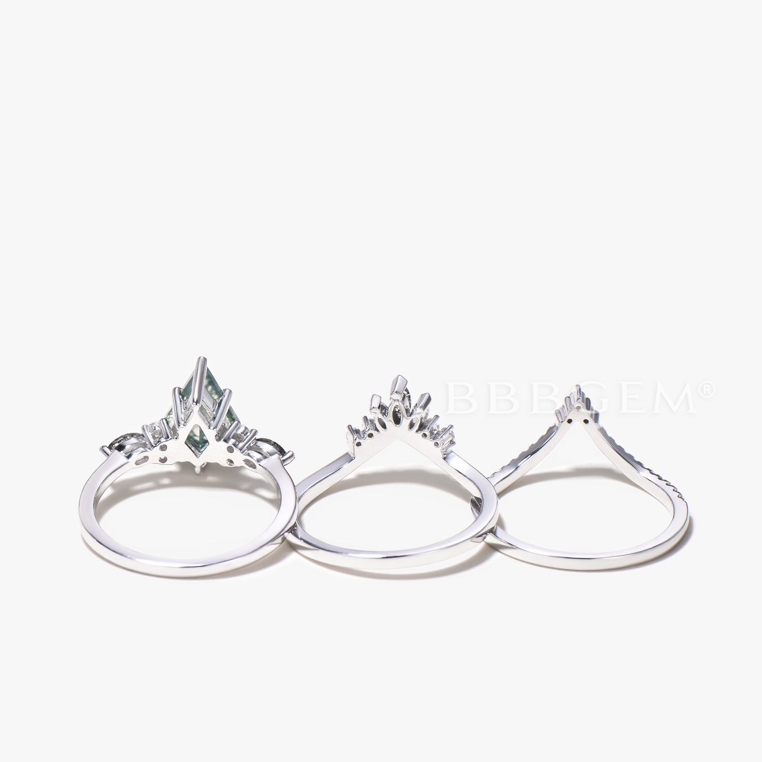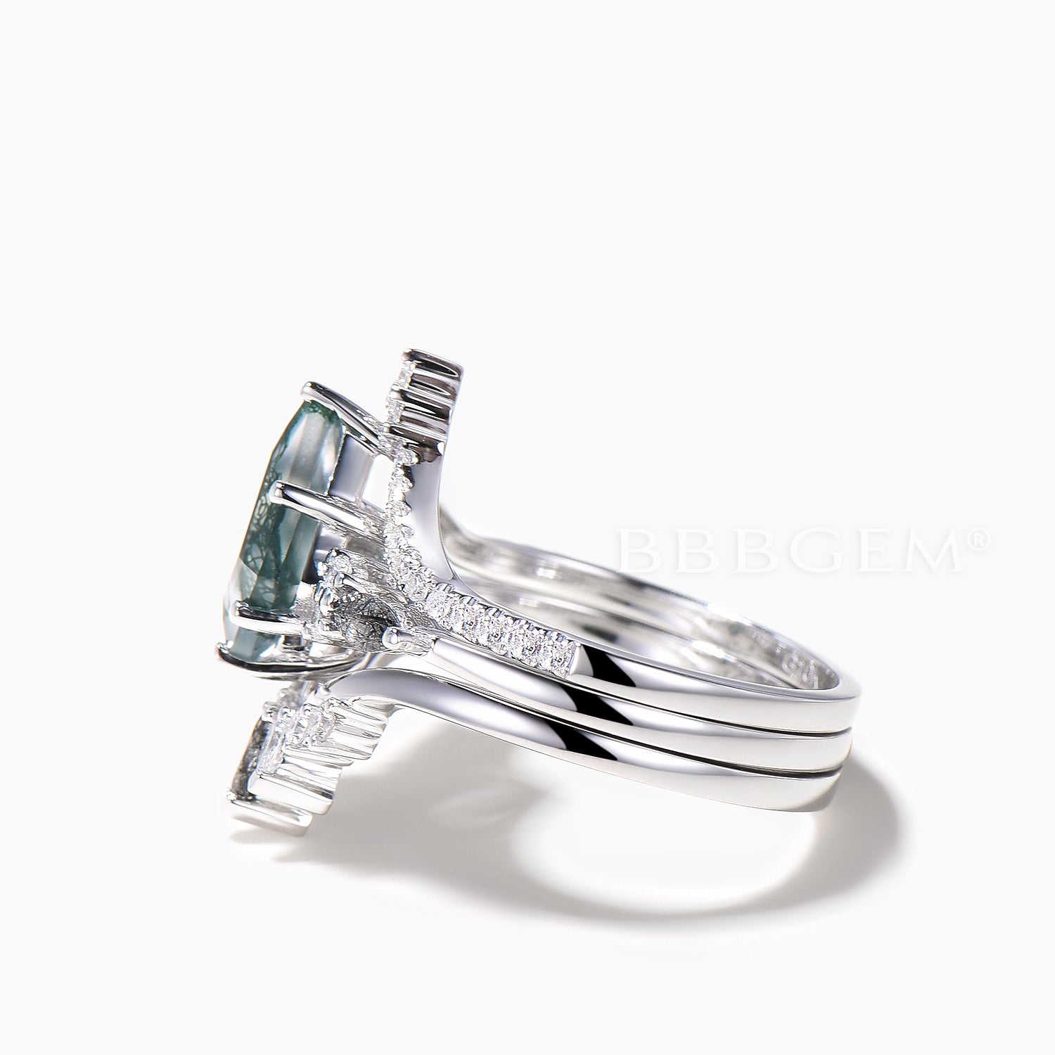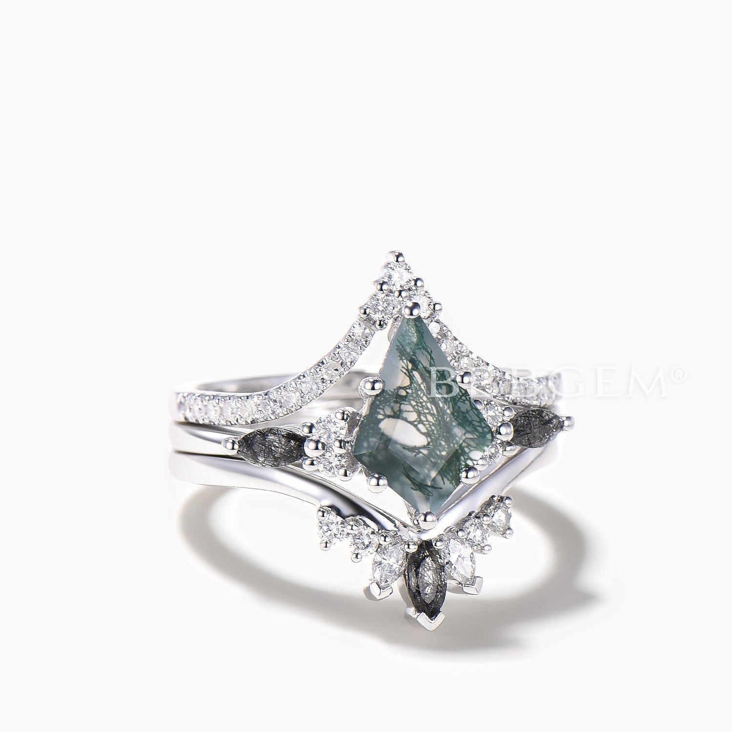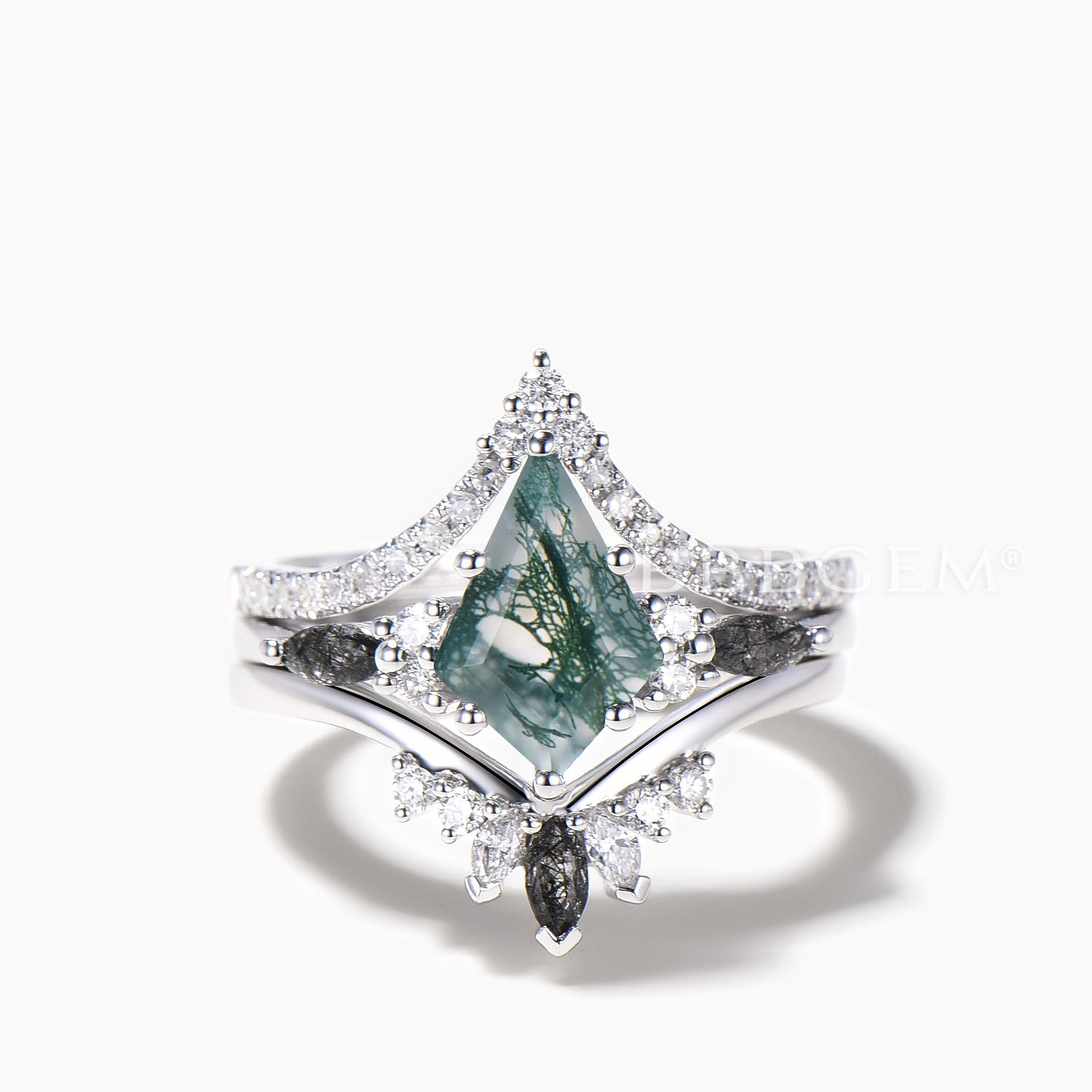 3PC Agate Bridal Set Kite Cut Natural Moss Agate Wedding Ring Diamond Curved Band
