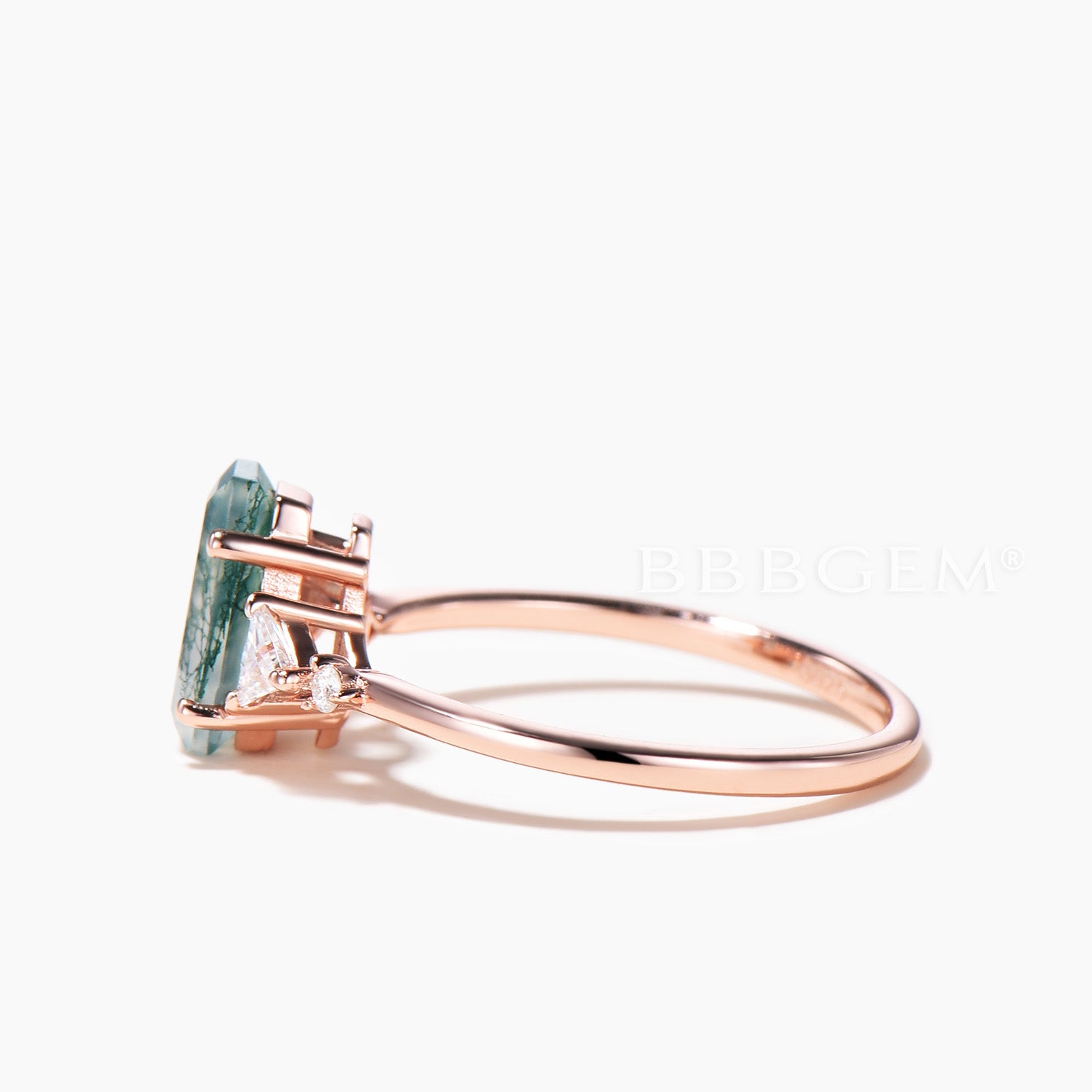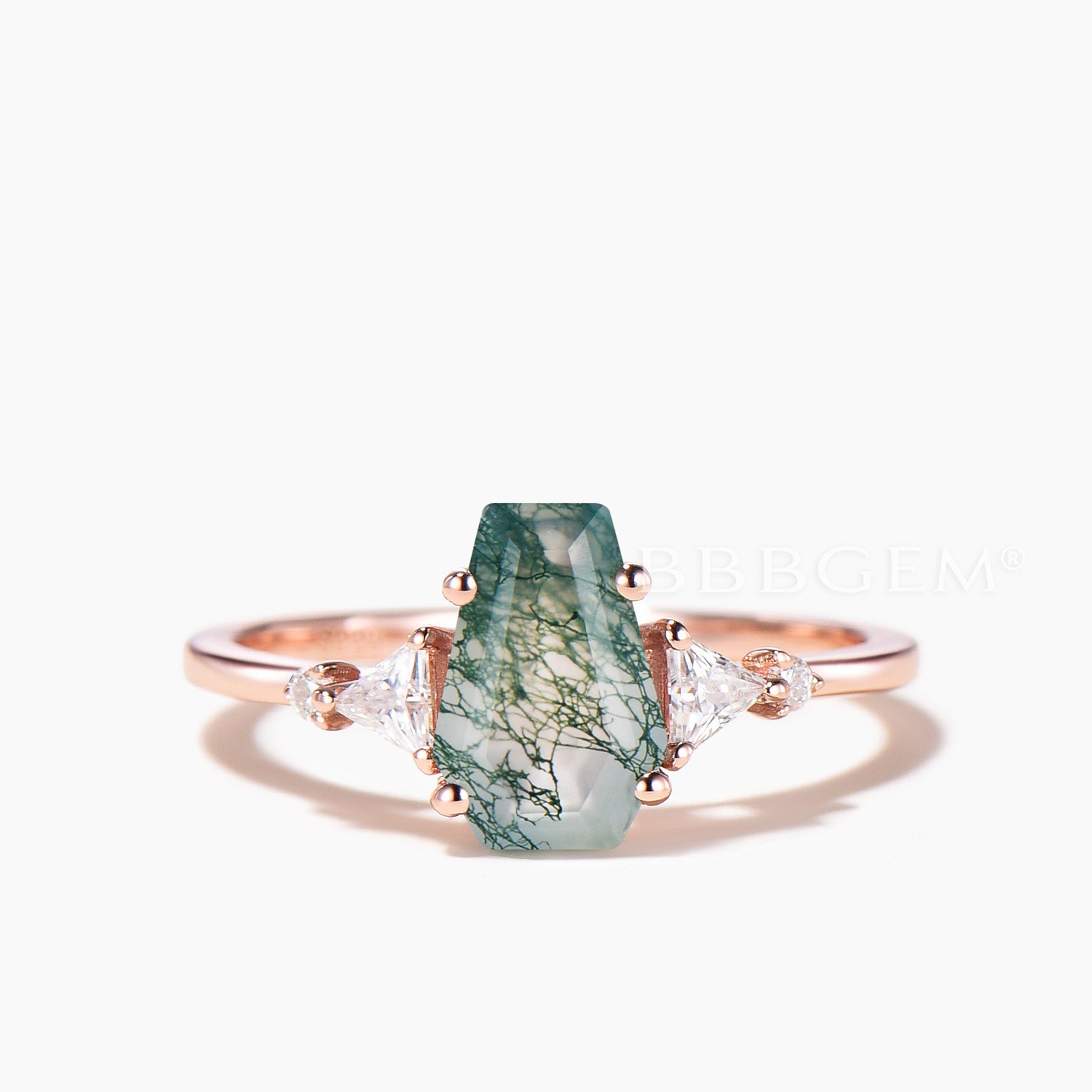 Coffin Cut Natural Moss Agate Engagement Ring Trillion Moissanite Cluster Ring