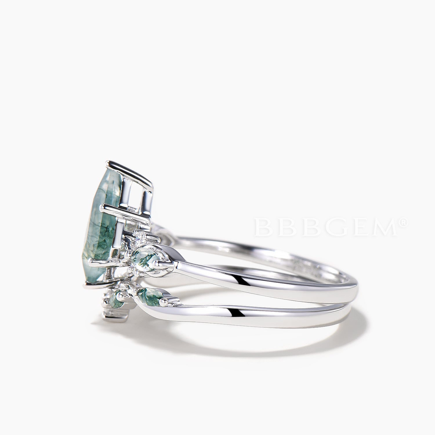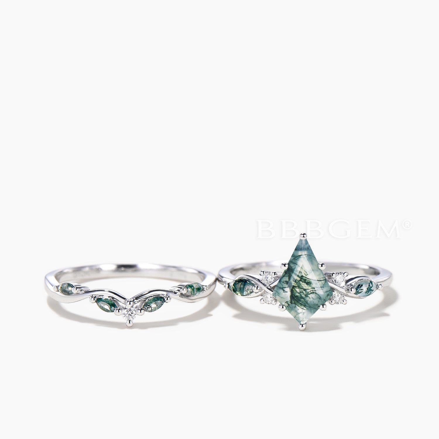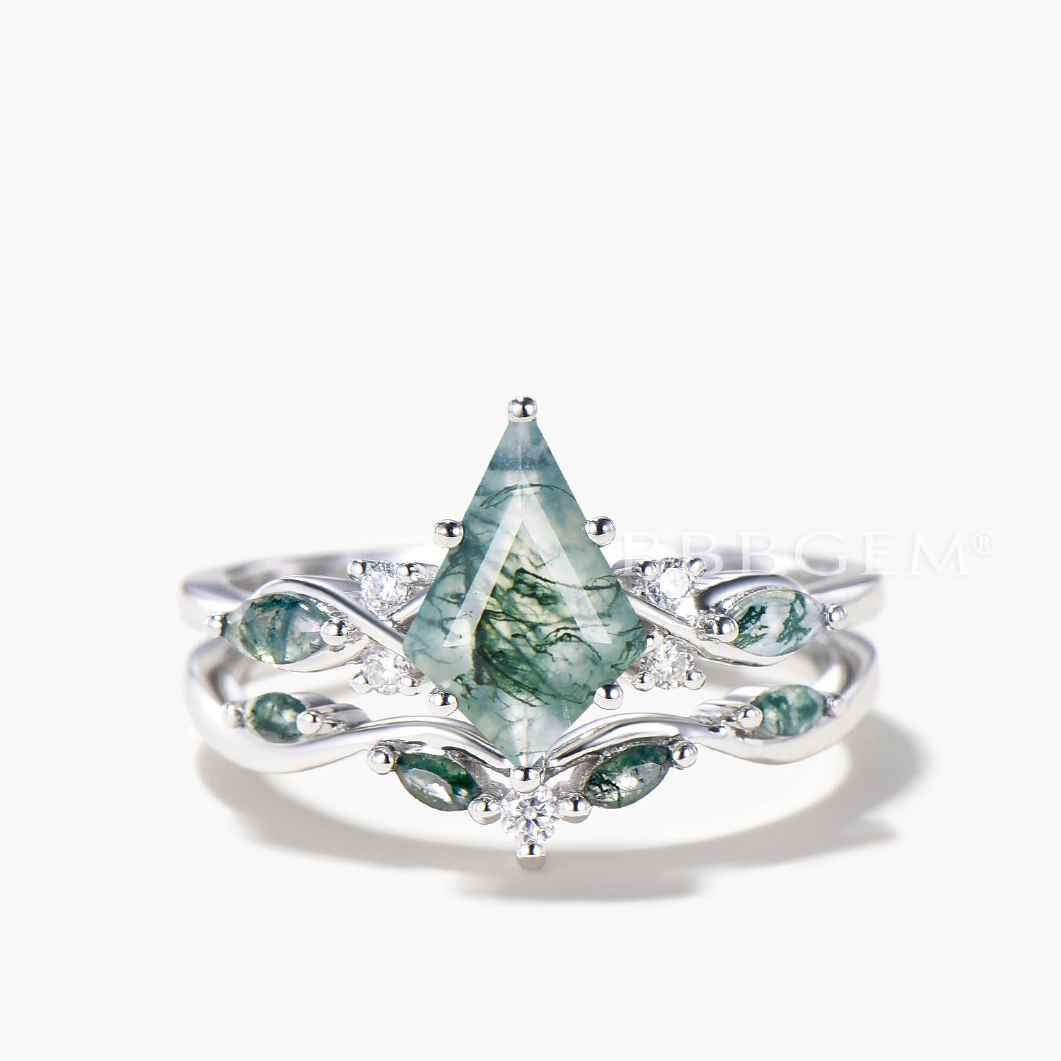 Kite Cut Natural Moss Agate Engagement Ring Agate Diamond Bridal Set