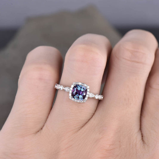 Alexandrite Diamond Engagement Ring Marquise Shaped Band 6mm Cushion Color-Changing Gemstone Ring Art Deco