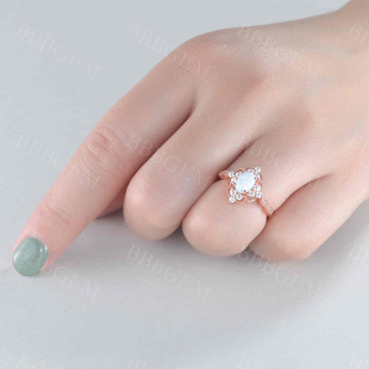 Vintage Opal Engagement Ring Rose Gold Diamond Wedding Oval Milgrain Halo Anniversary Ring