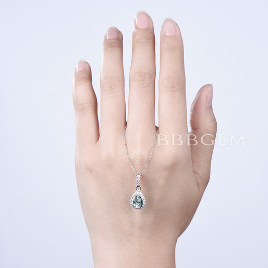 Teardrop Green Moss Agate Pendant Diamond Halo Necklace Charm Necklace