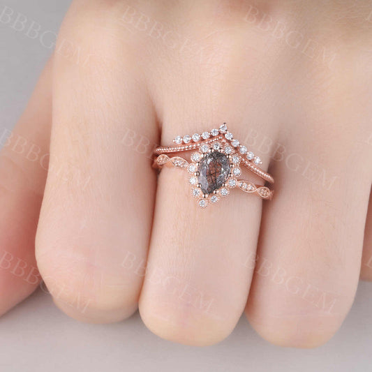 Pear Shaped Black Rutilated Engagement Ring Rose Gold Diamond Wedding Ring Black Gemstone Ring Anniversary Gift