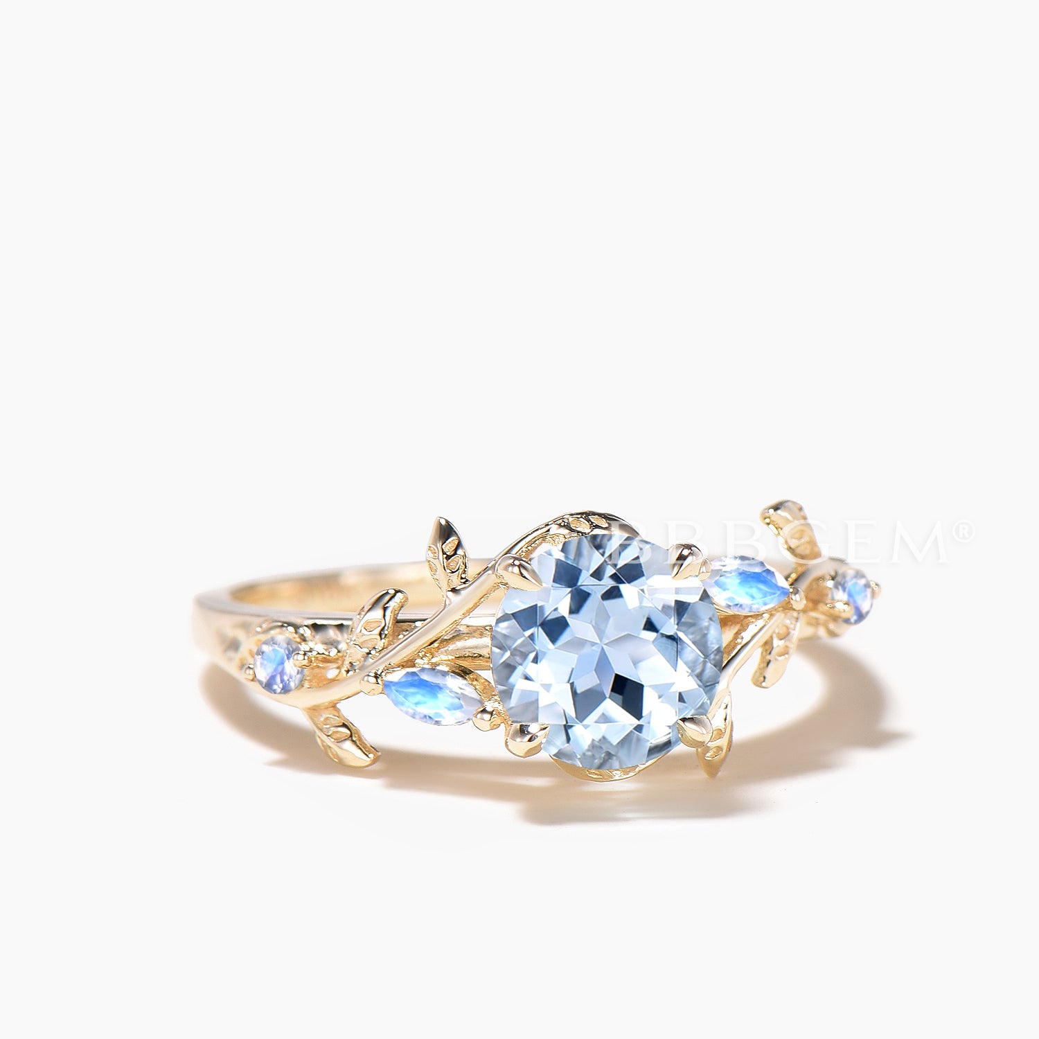 Round Natural Aquamarine Engagement Ring Moonstone Leaf Nature Inspired Ring