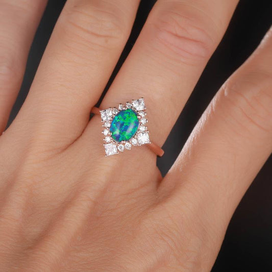 Art Deco Oval Cut Opal Engagement Ring Cluster Diamond Ring Rose Gold