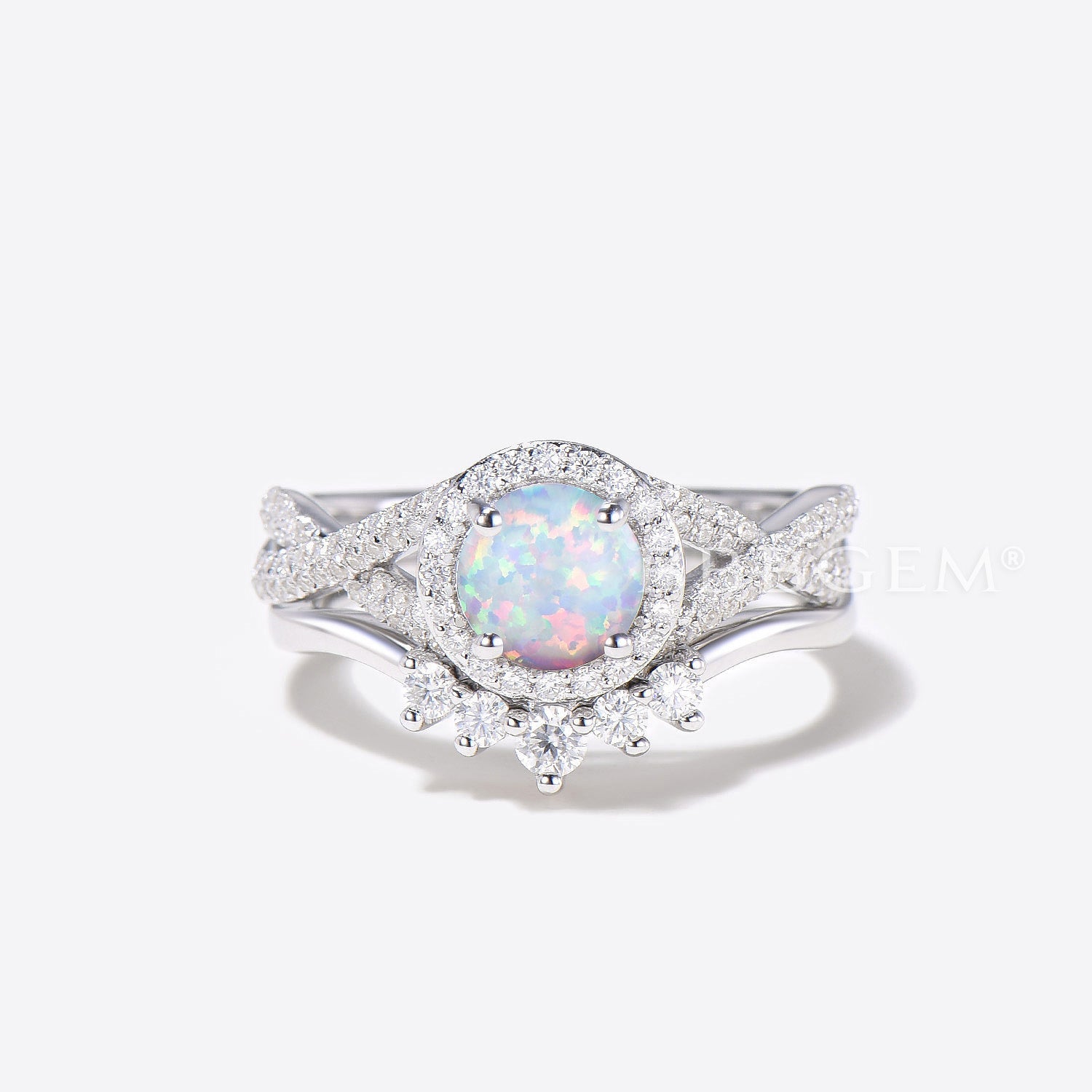 Vintage Opal Engagement Ring Set for Women Halo Diamond/Moissanite Wedding Ring White Gold