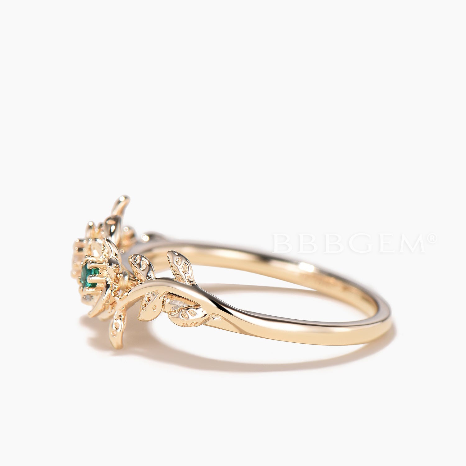 Round Cut Emerald Moissanite Floral Toi et Moi Wedding Ring Nature Inspired Ring