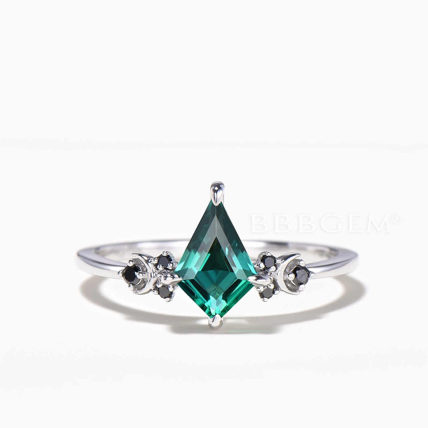 ***Featuring a striking kite-shaped emerald as the centerpiece, this ring captures the mystique of moonlight with a graceful crescent moon accent. Black spinel stones add dramatic sparkle, while intricate detailing creates an enchanting, organic feel.This unique set is perfect for brides seeking a blend of elegance, symbolism, and beauty in their engagement ring.***