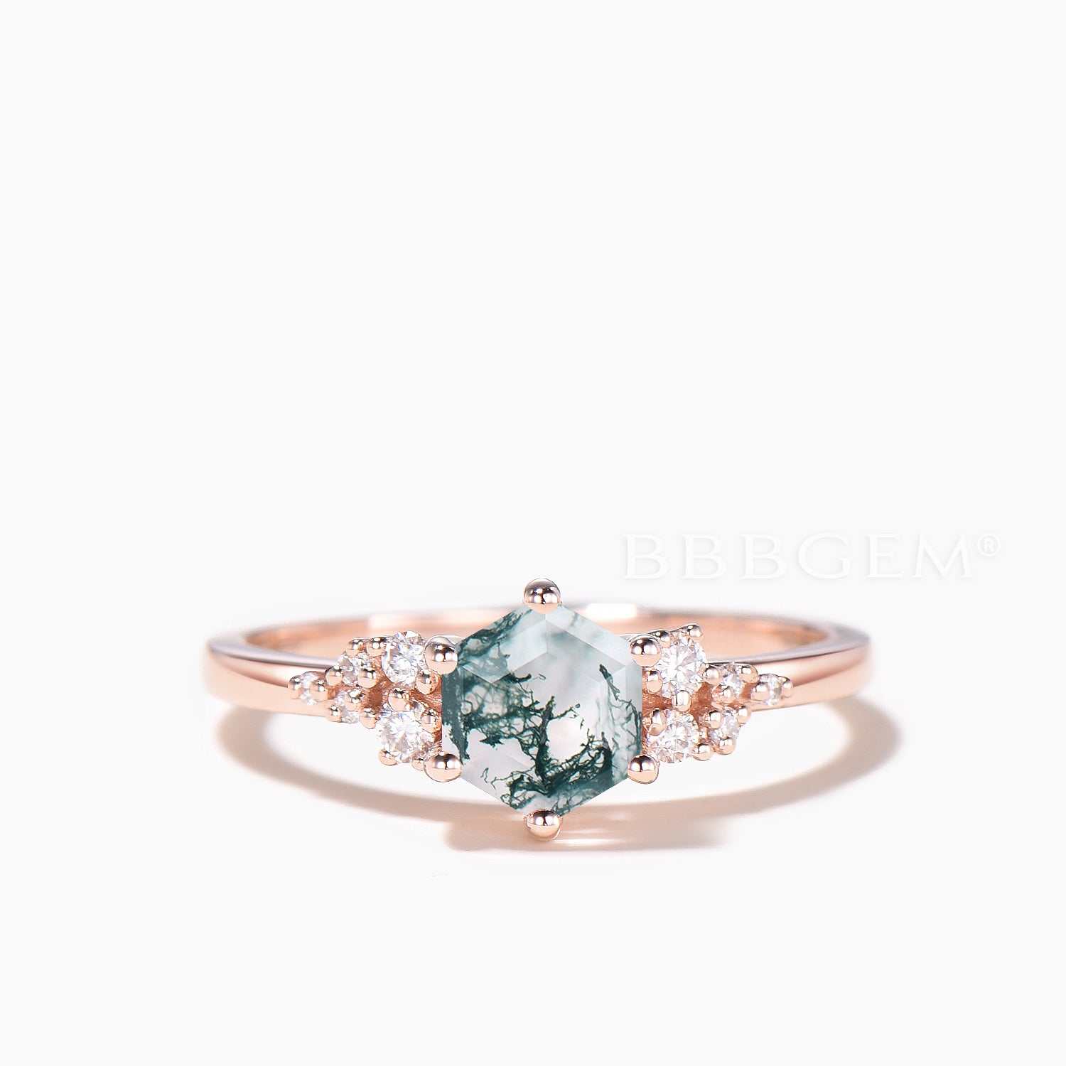 Diamond Cluster Rose Gold Ring Hexagon Cut Natural Moss Agate Engagement Ring