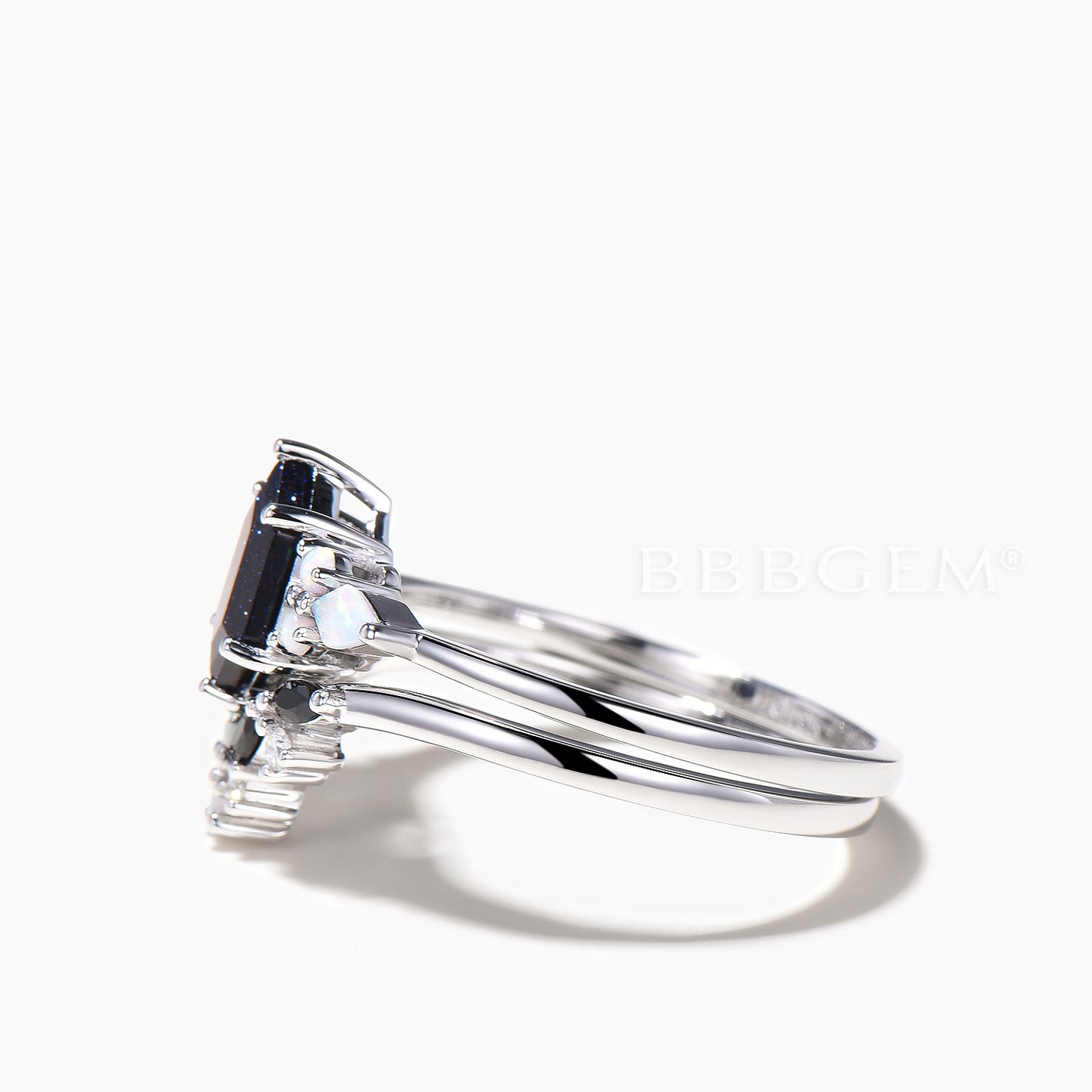 Hexagon Cut Blue Sandstone Wedding Ring White Opal Black Spinel Bridal Set