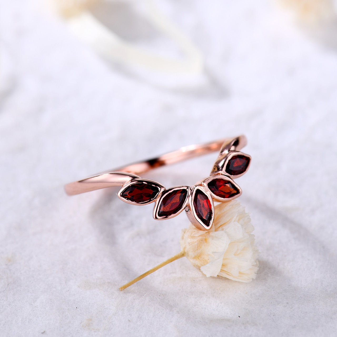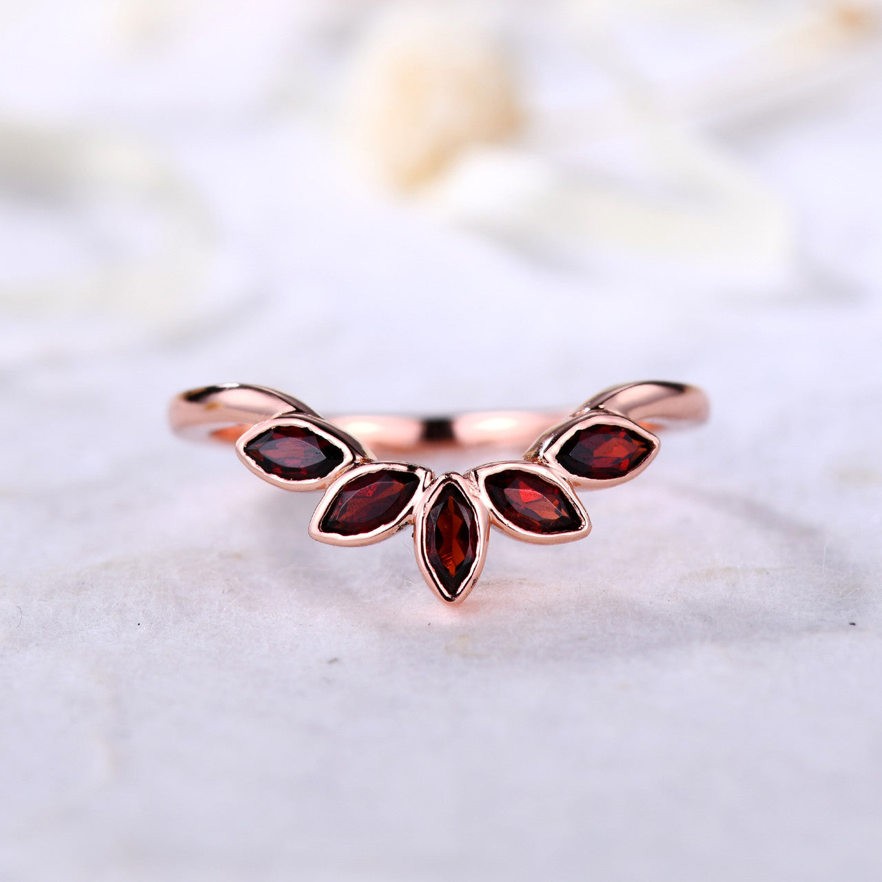 Curved Garnet Wedding Band, 4x2mm Marquise Shaped Garnet Matching Band, Garnet Anniversary Birthday Gift, January Birthstone, 14k/18k Solid Rose Gold, Garnet Promise Ring
