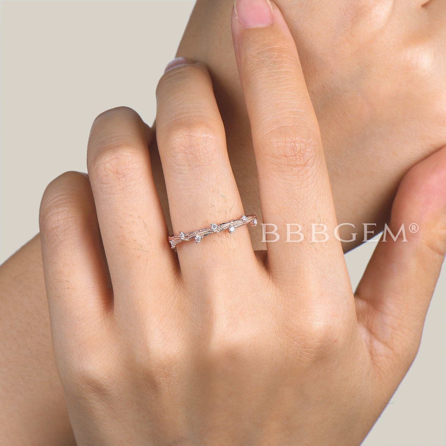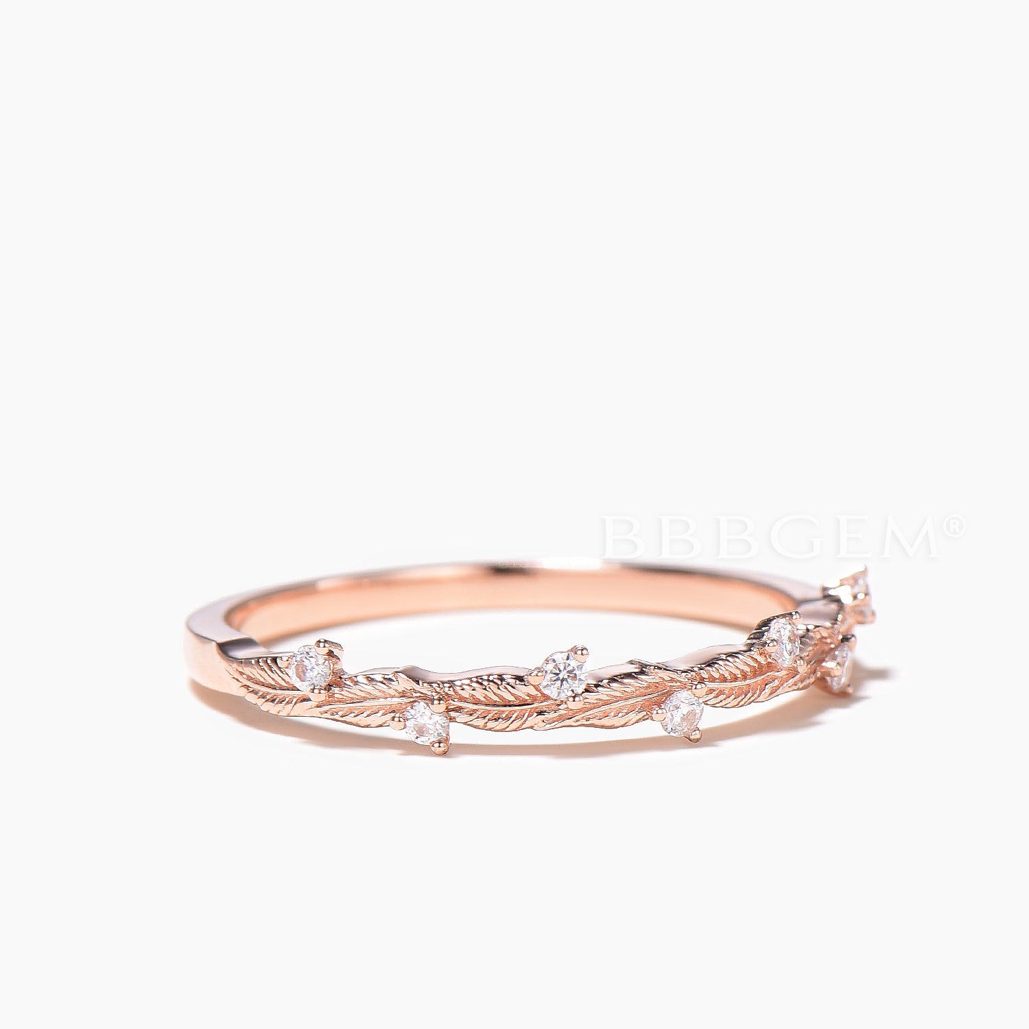 Round Diamond Leaf Wedding Ring Rose Gold Nature Inspired Half Eternity Band
