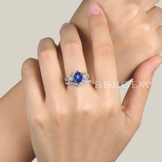 1.5CT Oval Cut Star Sapphire Solitaire Engagement Ring Leaf Wedding Bridal Set
