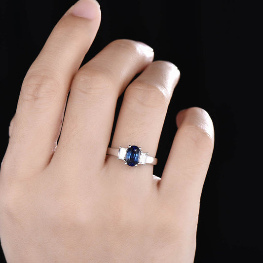 Vintage Natural Oval Cut Sapphire And Baguette Cut Moissanite Engagement Ring Three Stone