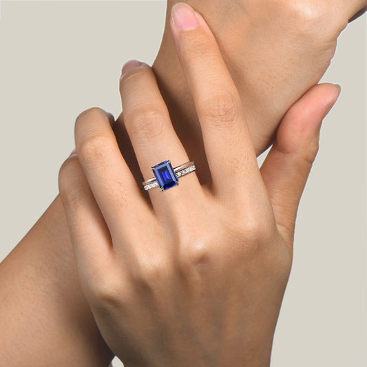 2CT Emerald Cut Blue Sapphire Solitaire Wedding Bridal Ring Hidden Halo Ring