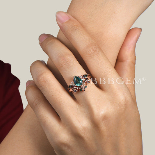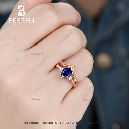 Nature Inspired Pear Blue Sapphire Ring Set Vintage Sapphire Emerald Bridal Ring Set Twig Leaf Vine Wedding Ring September Birthstone Jewelry