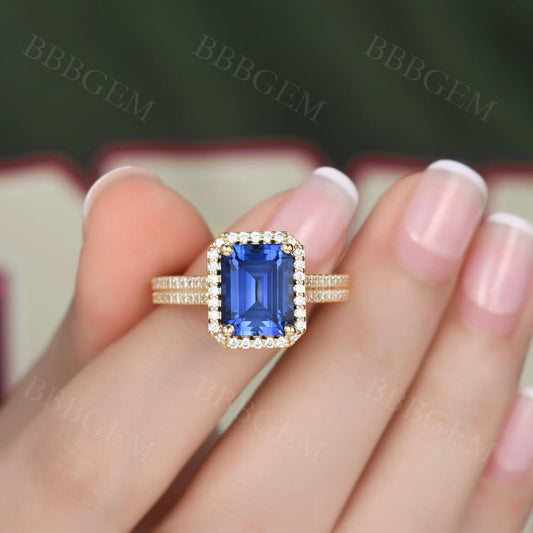 Vintage 8X10mm Diamond Halo Emerald Cut Sapphire Ring Yellow Gold Diamond Wedding Band 4 Carat