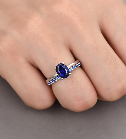 Sapphire Ring Blue Sapphire Engagement Ring Diamond Male Ring 4x5mm Oval Shape And 3x4mm Pear Cut Lab Gemstone 14k White Gold
