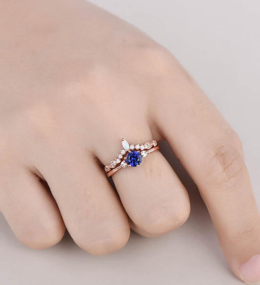 Sapphire Selene Diamond Ring And Opal Stackable Band 2pcs