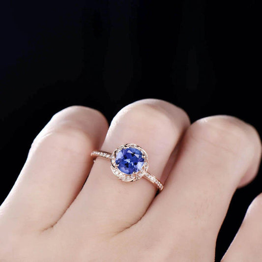Blue Sapphire Diamond Halo Women Engagement Ring Art Deco