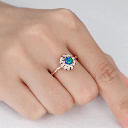 Opal Engagement Ring 14k 18k Rose Gold Round Cut Antique Art Deco Wedding Ring Milgrain Anniversary Gift Women Set