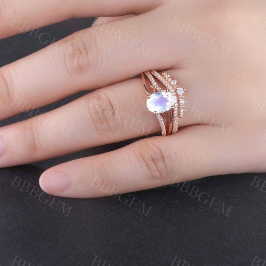 Round Diamond Wedding Ring Solid 14K Rose Gold Art Deco Marquise Three Stone Stacking Matching Band