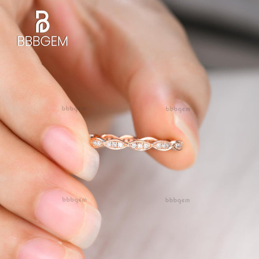 2pcs Diamond matching band in 14k rose gold/Milgrain wedding ring/Art deco marquise/Half eteniry ring/Milgrain edge anniversay ring/Pave set