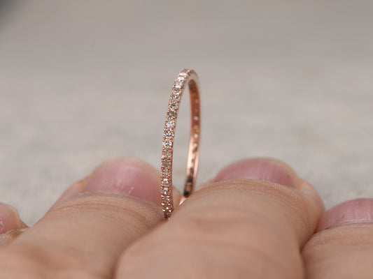 Round Diamond Wedding Ring Solid 14K Rose Gold Micro Pave Thin Design Full Eternity Matching Band